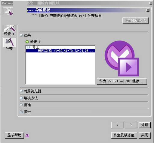 6、随后可以看到acrobat正在进行处理,处理完毕后显示如下界面,此时水印已经被删除,此界面关掉即可。当然,也可以在上一步“显示结果”的选项处选择“发生错误时”或“从不”避免每次都出现结果界面。