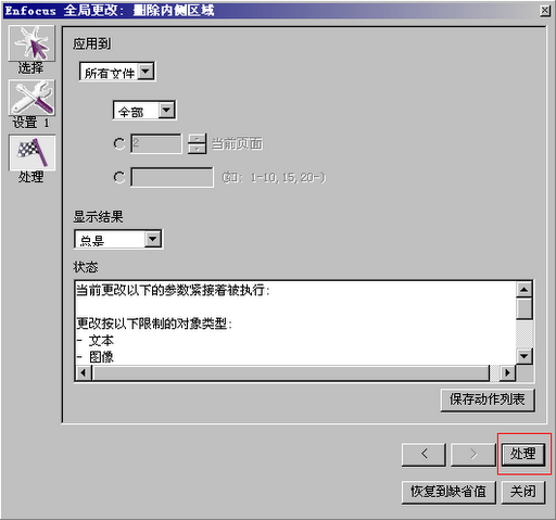 5、然后出现下图所示页面,在其中可以选择应用的范围,可以选择单页、所有页面、奇数页、偶数页等等。如果水印在文档所有页面都有,则这里可以不用修改,直接点击“处理”按钮即可。