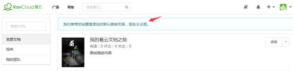 登录后默认页面是我的文档列表页面,如果你不是经常写文档的话,可以更改默认页面。