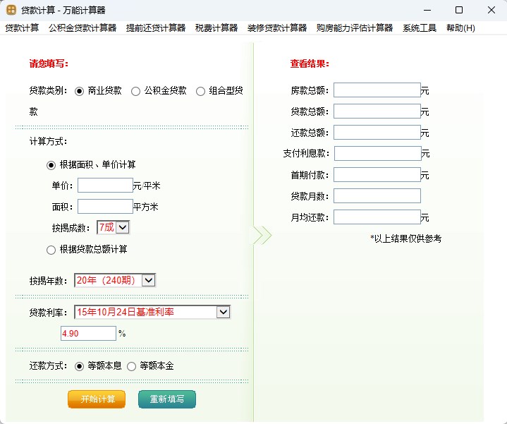 可帮助用户计算在购买二手房申请商业贷款时,选择等额本金和等额本息等不同的还款方式后,各自需要偿还的月供、利息总额和还款总额。