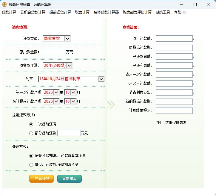 提前还款计算器为购房者提供2017提前还款计算器及各种购房贷款计算器,根据购房者的需求可以选择一次提前还清,部分提前还清,得出相应的计算结果。