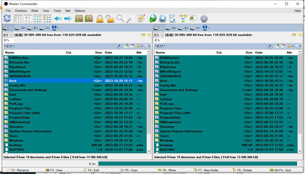 Master Commander是一款简单易用免费的高级资源管理器,master commander操作简单,但功能却很强大,该软件带有两个面板,目前为止还带有标签页式的显示方式,但在显示器宽度上就比较富余,这样一来两块横向并排的面板之间不会产生麻烦,是用户文件管理的一个得力助手,有了它还节省了许多的时间,master commander还集成了非常多的功能性插件在里面,例如:FTP,压缩,加密,制作IOS镜像,合并分割文件等,而且还集成了文字编辑器,这样的全面功能在其他同类软件中是比较少见的。和其他高级资源管理器一样,master commander采用了NC风格界面,双面板。每面板还可以打开多标签,支持多种主题风格,本站提供的master commander安全、无病毒、无恶意代码,请放心使用。