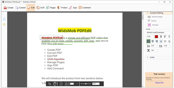 WidsMob PDFEdit(PDF编辑器)是一款功能多样的PDF编辑器,软件操作简单易于使用,支持像使用Office Word一样轻松简单的对PDF文件进行添加、删除、提取和编辑PDF文档内的文本和图像,同时你还可以调整PDF中文本的字体、大小、颜色和其他参数,以达到最好的效果。PDFEdit可以轻松灵活的添加和删除以及提取和编辑pdf中的所有文本和图像,并自由的进行相关元素的调整,有需要的话还可以添加水印、密码等来保护您的PDF文件,支持快速创建PDF文件,甚至可以直接将各种文件格式直接创建为PDF;PDFEdit还允许用户轻松裁剪、调整大小甚至添加水印,且采用先进的光学OCR识别引擎功能,可帮助用户将PDF文件中的文本提取为Word或其他文件格式,除了创建新PDF的基本方法外,用户还可以直接将Word、Excel、PowerPoint和其它200多种文件格式创建为PDF,只需将不同的文件组合成满意的PDF文件即可。