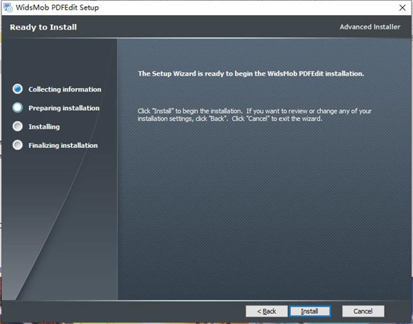 安装向导默认设置的软件默认安装路径为C:\Program Files (x86)\WidsMob Technology Co. Limited\WidsMob PDFEdit\