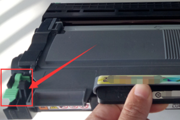 5、看到硒鼓外壳左边角上有一个绿色的按钮,把这个按钮按下去,然后将鼓芯轻轻拿出来。