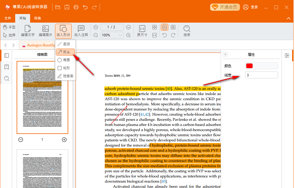4、形状添加功能,可以在文本添加红色的箭头,可以在右侧设置新的线宽;