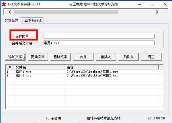 2、点击保存位置,设置合并成功后的文本存放的路径