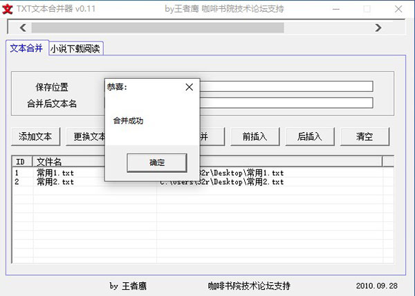 3、然后点击“合并”,等待数秒(根据文本内容、大小决定速度因素),软件提示“合并成功”之后,点击“确定”