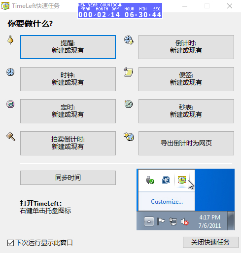 timeleft官方版是一个运用了Winamp的外皮,进行倒数/马表的程序。TimeLeft可以计算目前到下一个目标(年、月、日、时、分、秒)、或是距离目标过了多少时间;而这个目标可能是年底、生日或是你目前进行计划的截止时间。你可以自定警告用的声音、提示文字、图标等等。 TimeLeft在默认值中,会出现在你屏幕的左下角;不过你可以把它移到任何地方,「粘贴」在任何屏幕的边栏上。