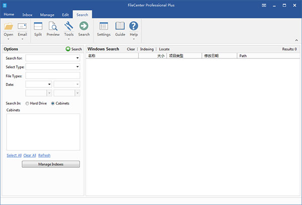 主界面FileCenter将可能被认为是几个不同程序的内容组合到一个单一的,流畅的界面中。您可以轻松地从一个任务转移到另一个功能,实现许多与日常文件相关的工作,而无需离开界面。您可以在这里看到FileCenter的主要部分,并向您显示要访问的功能的位置。如果您查看FileCenter界面的顶部,您将看到一行四个选项卡:文件、管理、编辑和搜索。