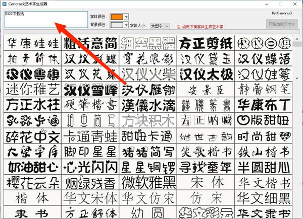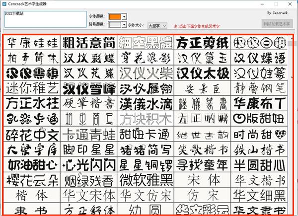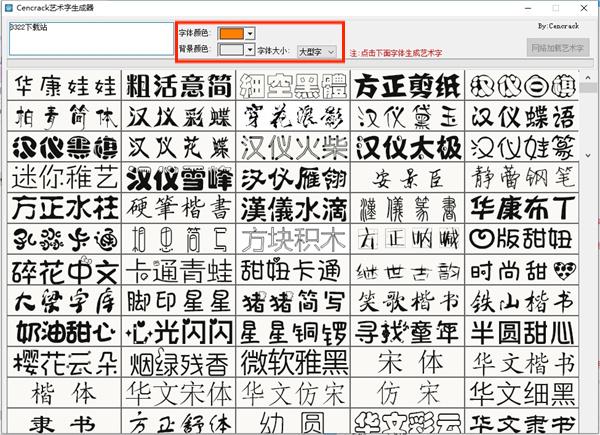 cencrack艺术字生成器是一款可以将您自由输入的文字转换成艺术形式的字体的软件,软件里内置了数百个艺术字体可供您随意转换,简易实用,还能够自定义调节文字的颜色、大小和背景颜色,马上就能生成自己想要的艺术字,非常有个性!