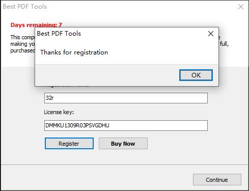 8、双击打开Best PDF Tools软件,将注册机中的注册码复制到软件对应位置,用户名可随意输入,点击Register