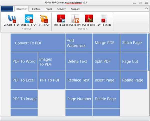 PDFdu PDF Converter官方版是目前市面上一款多功能的pdf转换工具,该软件支持将用户需要的pdf文件转换成为各种主流的文档格式,让你不用再为文档格式而发愁。而且还支持将pdf文件里面的内容进行各种编辑,包括添加水印、在线合并和拆分、将保护的PDF进行移除等多种多样的功能,同时软件还移除了PDF权限,让用户对文档进行密码的设置,可以设置文档打开密码,别人想要查看文档的时候需要输入正确密码,为文档提供安全防护。相比其他的pdf转换工具,这款软件还有可将PDF进行替换成为文本、对免费在线搜索的功能、免费在线搜索的功能、删除到等功能支持、支持将大的文件进行分割的操作、旋转、编辑和保护文件等特色,让你轻松完成任何文件格式的转换。