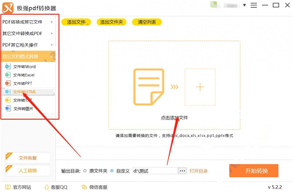 2、解压完成后,打开软件主界面根据用户需求选择相应的转换功能“其他文档转换”中的“文件转HTML”,然后点击“添加文件”。