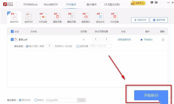 7、完成以上所有步骤后,我们在界面右下角找到“开始拆分”按钮,点击该按钮就可以开始拆分PDF文件了。