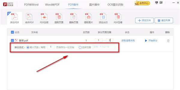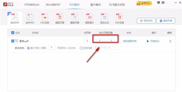 4、然后在界面上方找到“拆分页面范围”选项,我们在该选项下方的文本框中输入页面拆分范围即可。