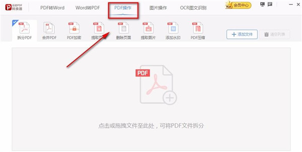 1、首先打开软件,我们在界面上方找到“PDF操作”选项,点击该选项就可以进入到PDF操作页面。