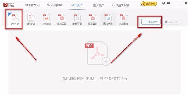 2、进入到PDF操作页面后,我们点击界面左上方的“拆分PDF”选项,并点击界面右上方的“添加文件”按钮。