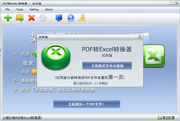 pdf格式的电子文档在现今的互联网十分流行,大家都见过多种多样的pdf转word、txt、HTML等等,但是转excel的却少之又少。现在,小编为你带来了一款专门应对pdf转excel的转换器,而且是pdf转excel转换器免费版,解锁全部功能,无需付费注册,让你免费享受该软件!pdf转excel转换器与国产的捷速pdf转换器不同,捷速pdf转换器可以转换多种格式,但是,捷速PDF转换器却没有免费版,只有试用,不过试用只能转换前3页电子文档,十分不方便。pdf转excel转换器不但能够快速的转换pdf电子文档,还能批量转换以及限定pdf内的范围进行转换。有了PDF转Excel转换器,你可以方便的将PDF文档转换为Excel表格,非常方便的将PDF里的表格文字、数字和其他信息抽取出来,进行编辑、计算或者汇总。因为有些PDF文档,只有部分页面含有表格。PDF转Excel转换器支持设定转换页面范围,可以转换您所需要的PDF部分页面到EXCEL表格,方便在excel中直接进行编辑使用,有需要的朋友可以下载哦。