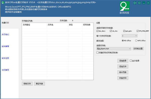 奈末Office批量打印助手是一款非常实用的打印辅助工具,它可以为用户提供office所有文件的批量打印服务,让用户不需要打开多个文档才可以完成打印操作。同时,在使用奈末Office批量打印助手进行打印的时候,你还可以设置每个打印文档的份数和打印机,不管是本地打印机还是共享打印机都可以支持它的使用,可以为打印业务的用户提供最佳的解决方案。和同类软件相比,奈末Office批量打印助手虽然名字上是只能使用office软件的打印,其实金山的wps也可以使用它的批量服务。有需要的朋友欢迎下载体验。