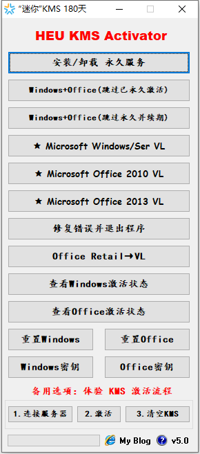 8、附加项:“KMS激活流程”下面的选项(步骤1、2、3)可以手动激活相应的版本。