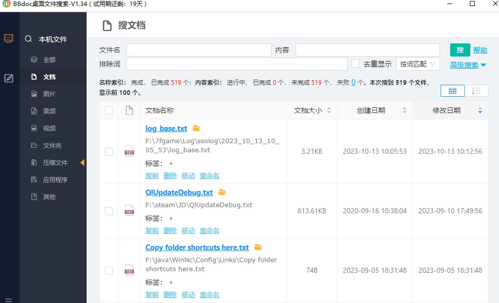 BBdoc文档搜索工具官方版是一款小巧但功能强大的文档搜索软件。可以对你的电脑文档文件名和内容进行搜索,快速查找你所需要的文档,搜索速度非常的快。操作十分简单,设置一下文档类型、大小、名称,文档内容就可以对电脑里的文档进行扫描、扫描完成可以直接查看文档,也可以进入文档目录。支持文件名、文档内容快速搜索,还能够对文件类型、文件修改时间进行筛选,是我们日常办公的好助手。支持按照文档类型搜索,目前支持word、pdf、Excel、压缩文件、csv、wps、txt等。支持按照文件大小搜索,也支持按照文件大小排序。欢迎下载体验!