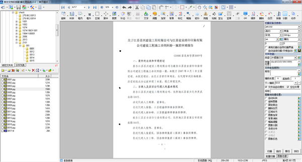 提供大量强大的图像处理功能,如:旋转,纠斜,框内去污,框外去污、区域,裁剪,补边,去黑边,去噪点,去装订孔,图像居中,幅面调整,图像加深,文字加深,图像亮度、对比度、饱和度调整,背景消除,智能修补,手动克隆,底色填充,图像拼接(两A4图像合为一个A3图像),图像分割(一A3图像分拆为两A4图像),文本标红,红头文件优化及图像剪切、拷贝、粘贴、删除等等;