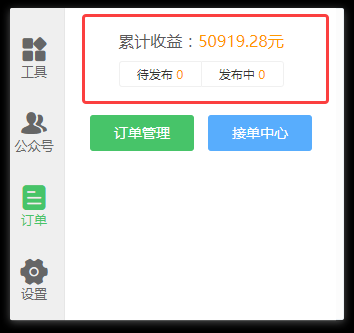 (1)显示所有订单收益金额和发布中的订单数以及待发布的订单数,以便快速查看收益和了解订单状态;
