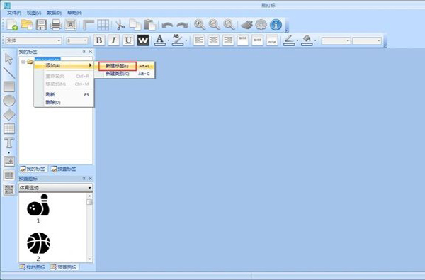 1、新建标签 首先我们要新建一个标签文件。用鼠标右键点击软件主界面左边我的标签列表,打开右键菜单。点击右键菜单中的添加,展开添加列表,选择新建标签,就可以新建一个新的标签;