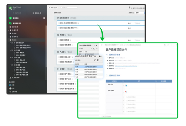 一键生成笔记目录,团队资料可根据业务、项⽬需求创建笔记链接,存储和组织团队知识