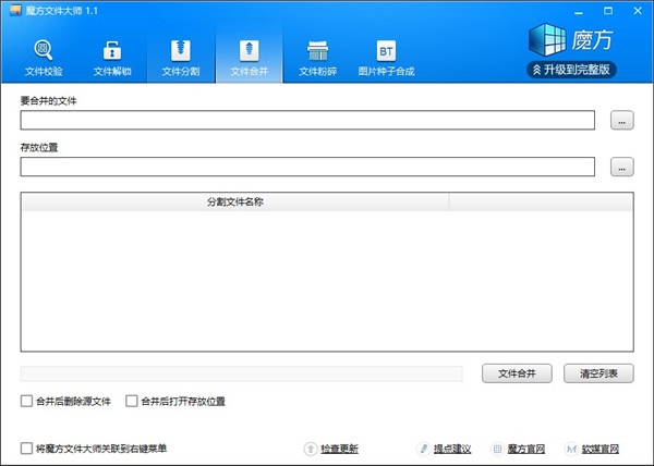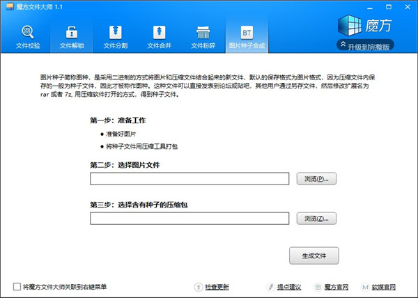 魔方文件大师官方版是一款集合文件校验、文件解锁、文件分割、文件合并、文件粉碎、图片种子合成于一体的工具助手。通过该款软件用户们可以解决在使用电脑途中碰到的绝大部分问题。例如文件校验功能,可以帮助用户们在检查文件是否有过修改的问题,特别是对于那些操作系统来说,毕竟一个被修改了程序会不会有后门之类的问题,用户们也不曾得知;文件粉碎以及文件解锁,则是可以帮助用户们解决电脑上那些顽固文件以及占用文件存储,要不然的自己一个个找那个进程占用了文件会是个非常痛苦的过哦。本次带来的是魔方文件大师官方版,下载解压便可使用,无任何垃圾注册表文件的产生,保持计算机应有的效率。