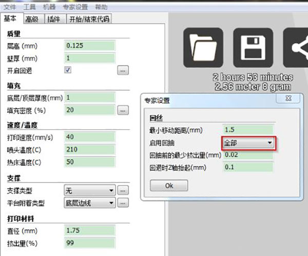 3、调整打印的参数,点击:>层高0.125mm>壁厚1mm>开启回退以避免回丝时的混乱,参数设置如下。