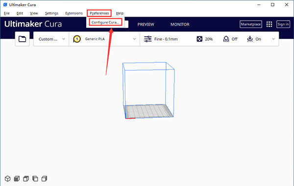 1、成功安装并启动cura软件后,先点击上方菜单栏的【Preferences】-【Configure Cura】。