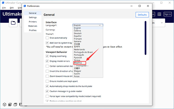 3、选择完成后,【退出并重启】cura软件,即可享受全中文的语言界面了。