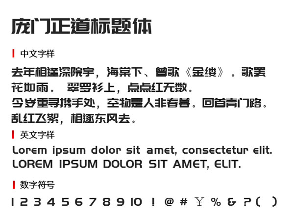 庞门正道标题体是由庞门正道设计公众号以及字游空间创意工作室联合研发而且可免费商用的字体,整体字形笔画均衡,风格现代,字体方中带圆,端庄雅致,简约时尚。庞门正道标题体有着非常方正的字体表现力,边角设计的有棱角也有弧度,给人非常折中的感觉,但是整体看起来相当具有正气感。庞门正道设计师一共设计了两款字体,包括庞门正道标题体和庞门正道粗书体,本作品适用于胖体设计字体、标题设计字体、品牌设计字体、动漫设计字体等应用。欢迎喜欢的朋友下载收藏。