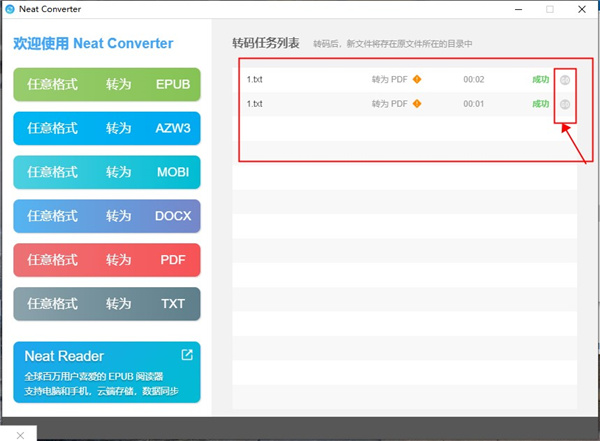 1、是一款功能超强操作轻松的专业电子书格式转换工具。 2、可以支持多种文件之间的互相转换,包括ePub、Azw3、Mobi、Doc、PDF、txt文件之间的转换。 3、充分利用最新的Web技术,而且转换速度超级快。 4、使用简单,不需要设置转换参数,打开一份文件就可以自动转换为指定的格式,一个步骤就即可迅速完成各种转码任务。 5、功能强大全面,结合具有美感的界面设计,精益求精,简单易操作,使用后可以帮助用户更轻松快捷的进行电子书格式转换操作,给用户提供很多使用便利。 6、只为让你享受到最好的阅读体验,阅读提高生活品质,Neat Reader 提高阅读品质。neat converter官方版使用说明