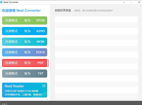 1、电子书转码器,是否收费?是否支持移动端? 该软件完全免费,没有任何收费项目,请放心使用。 2、电子书转码器,都支持哪些格式的转换? 支持 ePub、Azw3、Mobi、Doc、PDF、TXT 文件的相互转换。 3、日常生活中,为什么要使用 Neat Converter? 文件格式转码是一种很常见的需求。比如有很多朋友会在网上搜索“怎么让Kindle阅读ePub文件”,其实这样的问题,更好的解决方案是把ePub文件转码为Kindle原生支持的Azw3或是mobi文件。 另外还有一些需求,比如想要打印mobi格式的文件,但是一般的阅读器连打开mobi都不行,更别提打印了。此时你可以把mobi文件转码为docx或是pdf文件,然后用相应的阅读器打开,就可以打印了。更新日志