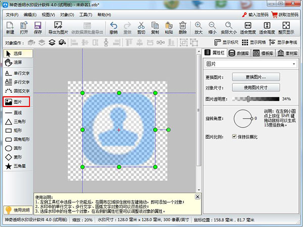 神奇透明水印是一款非常专业的设计水印软件,软件操作上手简单,能够设计各种软件的logo,商用标语,各种图片以及各个不同的宣传地方,使用非常的方便快捷。软件支持设计各种透明的水印效果,多种元素都可以自由添加,包括文字、图片、图形、圆弧文字等元素,用户可以自由发挥,任意进行设计出效果美观且实用的水印图片,可以根据不同的用户满足不同的设计需求。软件为用户提供了标题栏、操作按钮区域、工具栏、透明水印编辑区域、属性栏、模板库、素材库、缩览图等功能,还可以直接导入各种图片,设计非常的方便。在短时间内就可以设计出各种不同要求的透明图片水印,为有需要的用户能够提供强大的帮助。