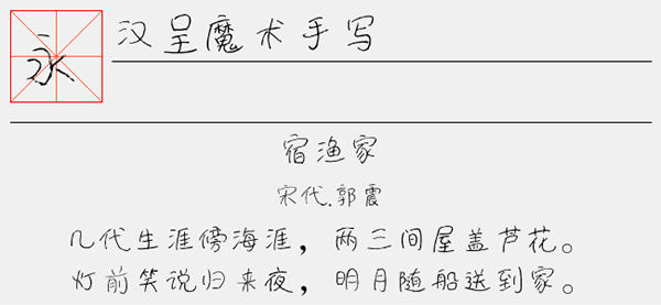 汉呈魔术手写字体是一款十分优秀好用的自带拼音且极细的手写中文字体,该笔法纤细,同时字形非常的行云流水,端庄得体,并上下结构却十分工整,看起来圆润可爱,并且中英文、阿拉伯数字全面支持,可以很好的应用于文本装潢、信息展示、网页设计、篆刻制模、数据制作、装潢设计、计算艺术设计、视觉设计、字帖等一切合法应用场景,有喜欢的朋友可免费下载收藏。