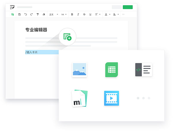 语雀自研编辑器,支持 文档、数据表、绘图 三大文稿类型,具备 Markdown、代码块、LaTeX 公式、PlantUML 等专业编辑能力,同时支持本地视频、Office 文件、PDF 文件等内容的上传与在线预览,可满足多种专业岗位需求,让创作更高效