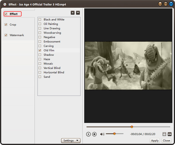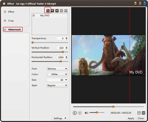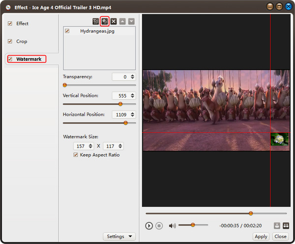第一步:在文件列表中选择一个视频文件,点击“效果”按钮的向下箭头,从下拉列表中选择“水印”选项,出现“效果”窗口。