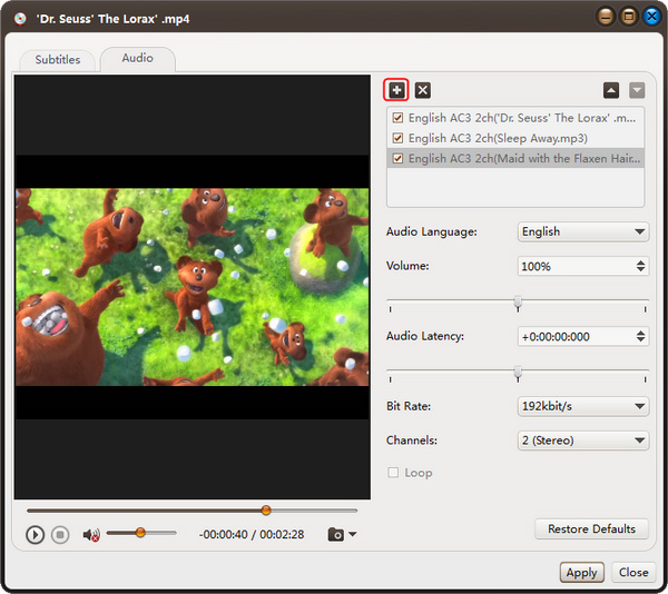 第一步:在文件列表中选择一个视频文件,然后点击工具栏上的“音频”按钮,进入音轨窗口,在弹出的对话框中,点击右侧面板的加号图标,选择您想要添加的音轨,音轨列表中就会显示该音轨。您最多可以在视频中添加8个音轨。