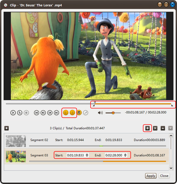 或者选择时间段,直接在时间段列表中输入起止时间。或者拖动播放器控制器上的左侧滑块来设置开始时间,拖动右侧滑块来设置结束时间。