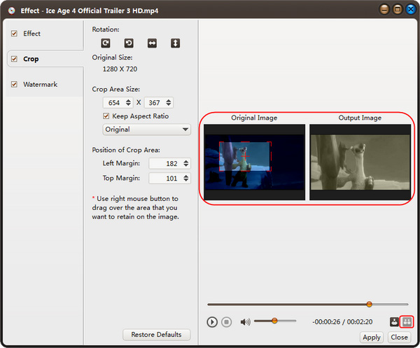 第二步:在“裁剪”选项卡上,在“裁剪区域大小”标签下方输入高度和宽度,在“裁剪区域位置”标签下方输入左右边距,设置裁剪区域。或者拖动预览窗口上的水平线和垂直线来设置裁剪区域。并根据自己的需要,勾选“保持长宽比”选项,从下拉列表中选择你想要的长宽比。