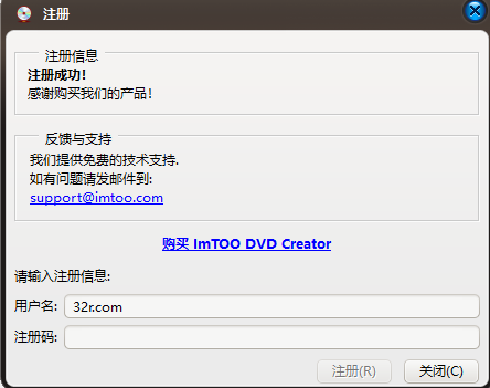 1、运行ImTOO DVD Creator程序 2、在弹出的提示框中输入注册信息,提交进行注册 1)用户名:32r.com 2)序列号:5222222222233333333318E2-BECE-73C3-B749