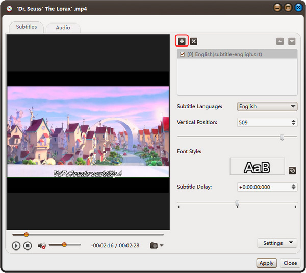 第一步:在文件列表中选择一个视频文件,然后点击工具栏上的“字幕”按钮,进入字幕窗口,在该窗口中,点击右侧面板上的加号图标,在打开的对话框中选择要添加的字幕,字幕就会显示在字幕列表中。您可以在视频中添加多达8个字幕。