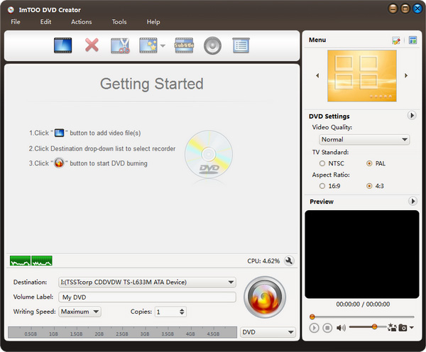 ImTOO DVD Creator中文版是一款高品质的DVD刻录工具软件,ImTOO DVD Creator能够转换主流的视频格式为DVD格式,并且能够刻录成DVD光盘并指定为NTSC或PAL制式,调整播放窗口为4:3或16:9大小,能把视频文件刻录成DVD光盘或者ISO的镜像文件,为DVD制作者提供了漂亮的功能按钮,它可以说是转换加刻录以及DVD光盘菜单制作三合一的软件,支持数种不同的来源影片格式,让我们只需要几个步骤,就可以制出一块含有 DVD 光盘菜单且适用于家用DVD播放器的DVD影音光盘。另外,为了方便用户使用,小编在下方随便附带了注册码,可免费注册,亲测有效。