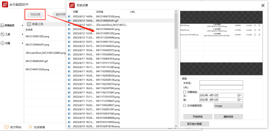 软件截图操作过程中产生的所有文件都会在这里显示,包含具体的名称、地址、大小等信息,可以选择历史文件再次进行编辑。