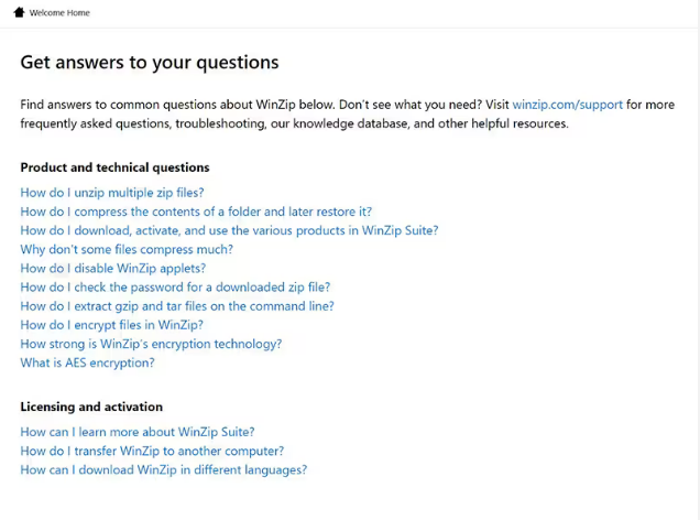 为了给用户提供更好的支持,WinZip 现提供应用内的常见问题解答模块,方便用户快速找到常见问题的答案。此外,用户还可以直接访问我们的线上支持页面和综合知识库,寻求进一步的帮助。这些资源确保了更流畅的 WinZip 体验,使用户能够找到实现高效文件压缩和管理所需的信息。