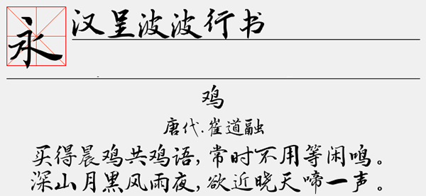 汉呈波波行书字体是一款由汉呈字库全新打造的行书字体,该字体在传统行书字体的基础上进行了创新,让字体不仅仅拥有了行书的亮点,还在第一眼看上去感觉非常的灵动飘逸,字形看上去非常的行云流水,有一点点的潦草,显得整体既视感更加出众。并且字形拥有笔触纤细、书写流畅、字型洒脱等特色,可为大家带来很好的视觉感。可以很好的应用于文本装潢、信息展示、网页设计、篆刻制模、数据制作、装潢设计、计算艺术设计、视觉设计、字帖等一切合法应用场景,有喜欢的朋友可免费下载收藏。